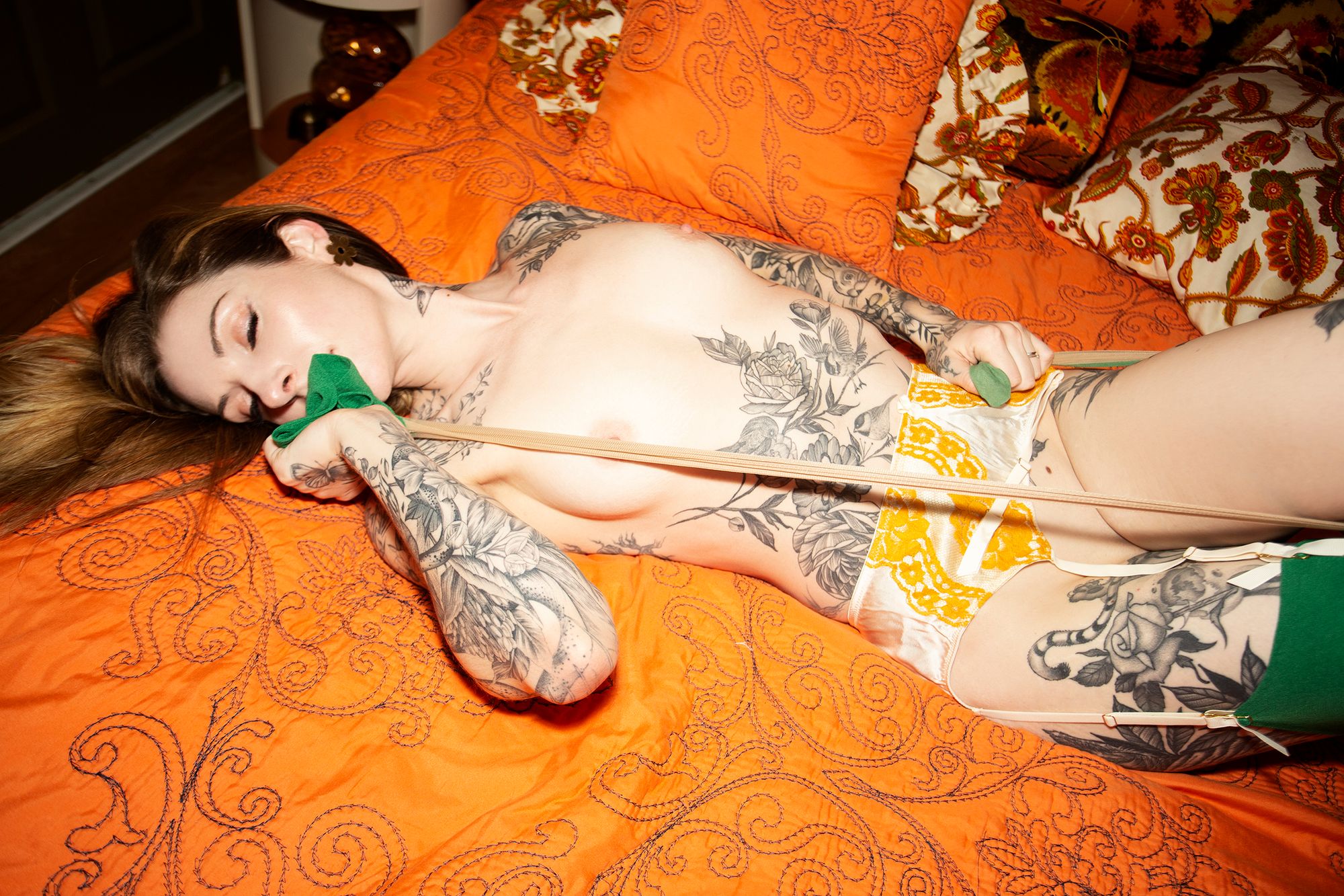 Three years ago, I took the plunge and fully left my vanilla career. I moved out to LA and began modelling for SuicideGirls. I always loved following alt models online but didn’t have the confidence to do it myself, despite being an avid tattoo collector. Porn was a natural next step for a sex worker and nude model, so I signed with an agent last year and started making professional porn. It’s all super fun and let’s me play around with various interests.