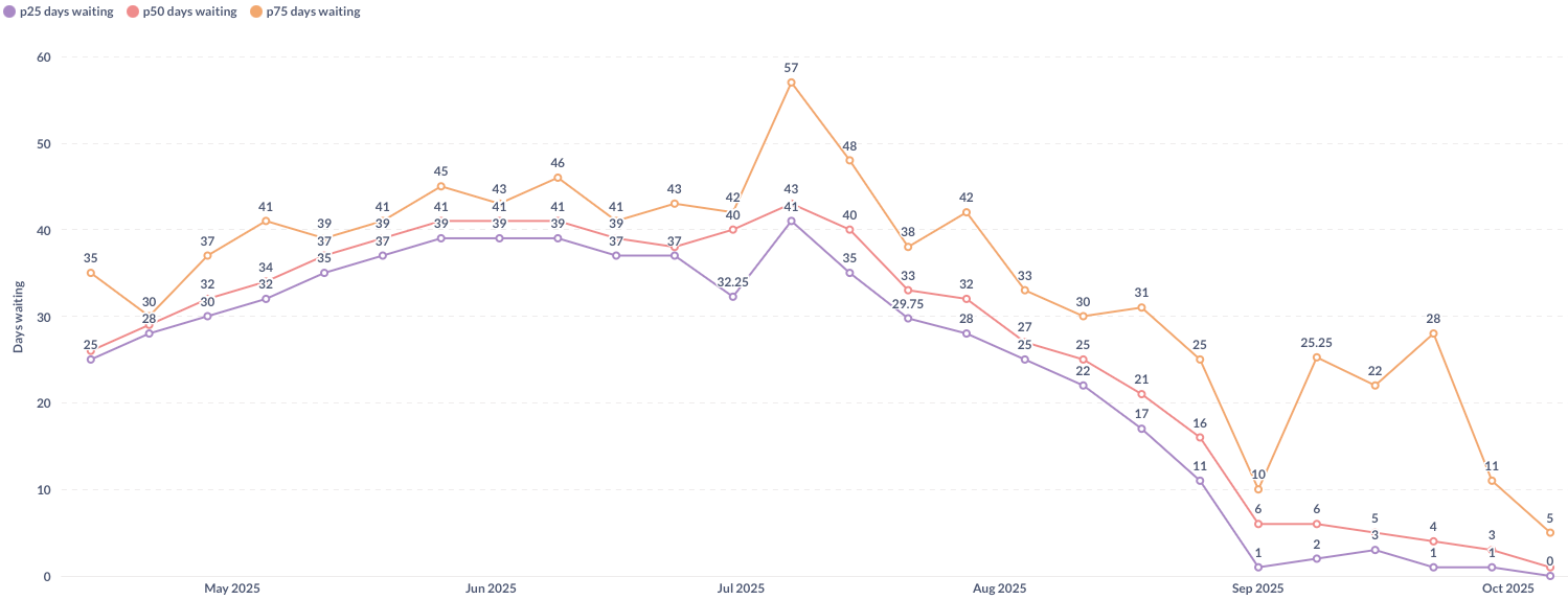 The 75th percentile is a bit choppier as it accounts for complex cases or scenarios where we need to provide more assistance helping someone through the process. Overall, our average processing time is three times better than it was in July, and our median is fourteen (14!!!!!!) times better!
