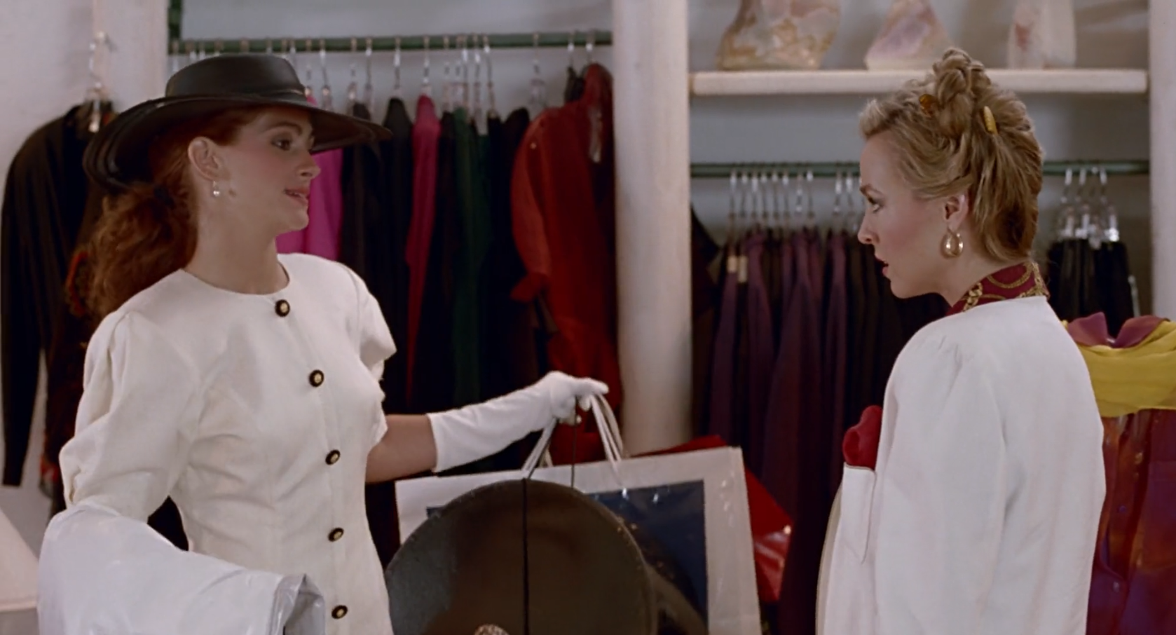 The vulnerability of her role as sex worker in ‘a man’s world’ never quite leaves her–as the sinister sexual assault scene with Edward’s lawyer Stuckey (Jason Alexander) reminds us. Becoming the mistress of a wealthy man does not offer her total freedom, but a new, more nuanced kind of marginality: the delicate task of having to continue to perform acceptability to retain her material comforts instead of the precarity of trying to relentlessly chase down the rent.