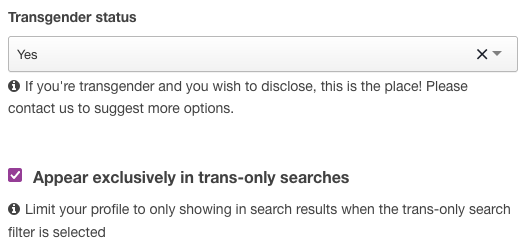 This month is all about giving more control to you, our users. Providers who show their trans status on their profile can now also limit their search visibility to only when the "trans-only" option is selected. This means you will only appear for clients specifically looking for trans providers and not for other