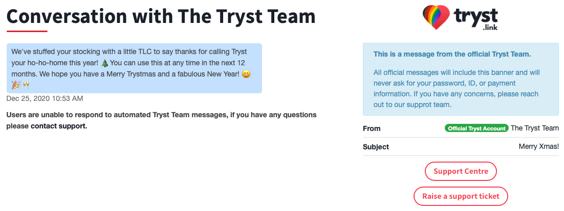 - We've made it much clearer when a message comes from the Tryst System user, if the message isn't in the new system format then it isn't officially from Tryst. We will never ask for your password, payment details, or other personal information via a system message.