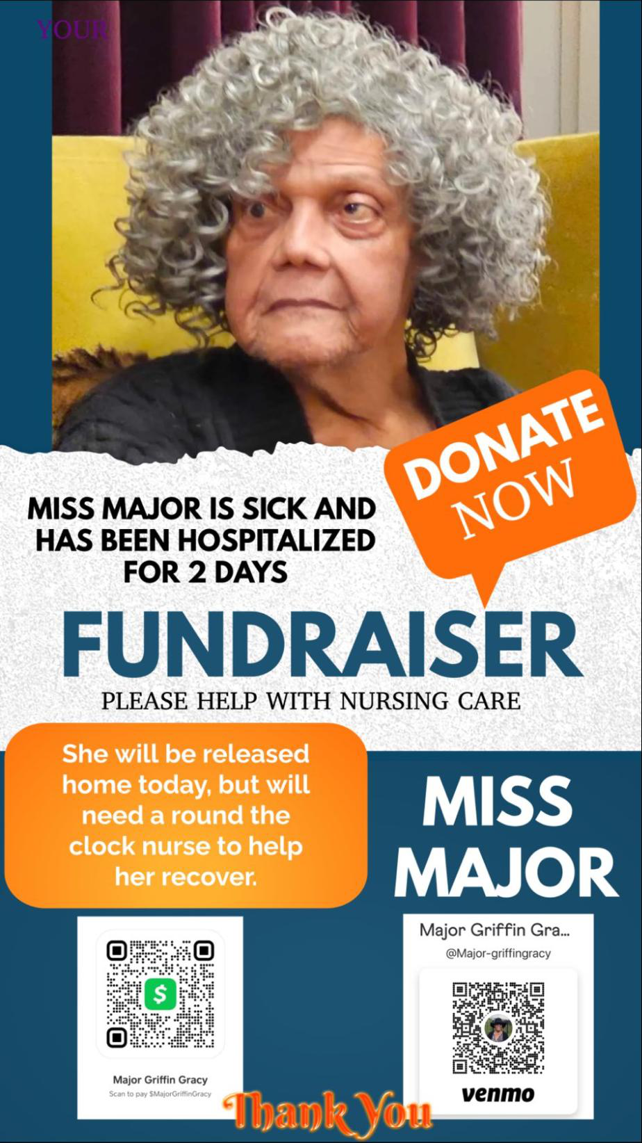 Sadly, on January 9th, 2025, her Twitter account announced that Miss Major had fallen ill and was hospitalized; she will now need a full-time nurse to assist her. She has worked to aid the lives of the oppressed for most of her life—certainly she deserves care and rest in her elder years. I hope that she lives in health and peace for many years to come! To help Miss Major, you can donate to her new recovery fund using the images in the graphic below. Long live Major!